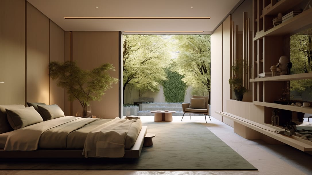 Award-winning professional architectural photography: frontal shot of an interior spacious living with a modern Japandi style luxurious interior design in a cozy London Penthhouse overlooking a japanese garden on the rooftop.Floor lamp, Led extrusions.Colour pallete: shades of green, earth tones, neutral colours. Keywords: Negative space, hygge, wabi-sabi, serene, texture, fabrics, professional photography. Hyperdetailed, 8k --ar 16:9