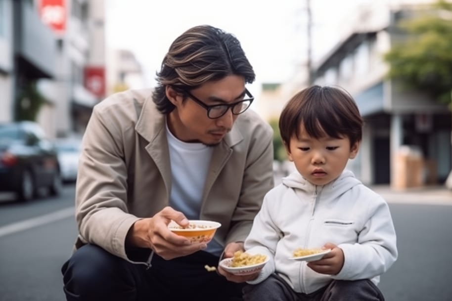 Japanese young handsome father teaches his son to eat natto on the road in Tokyo --ar 3:2 --s 250 --v 5