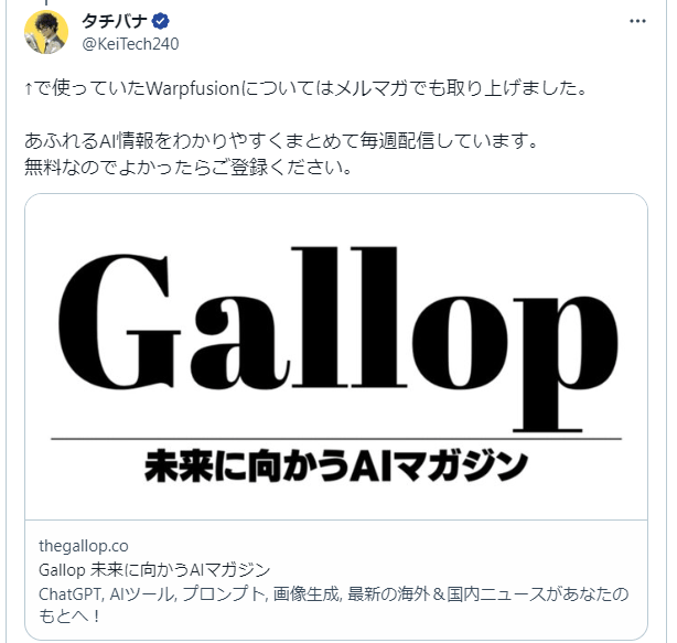 「タチバナさんの今週のメルマガ有益すぎませんか。。https://www.thegallop.co/ AIに興味ある人は絶対見るべき。」
